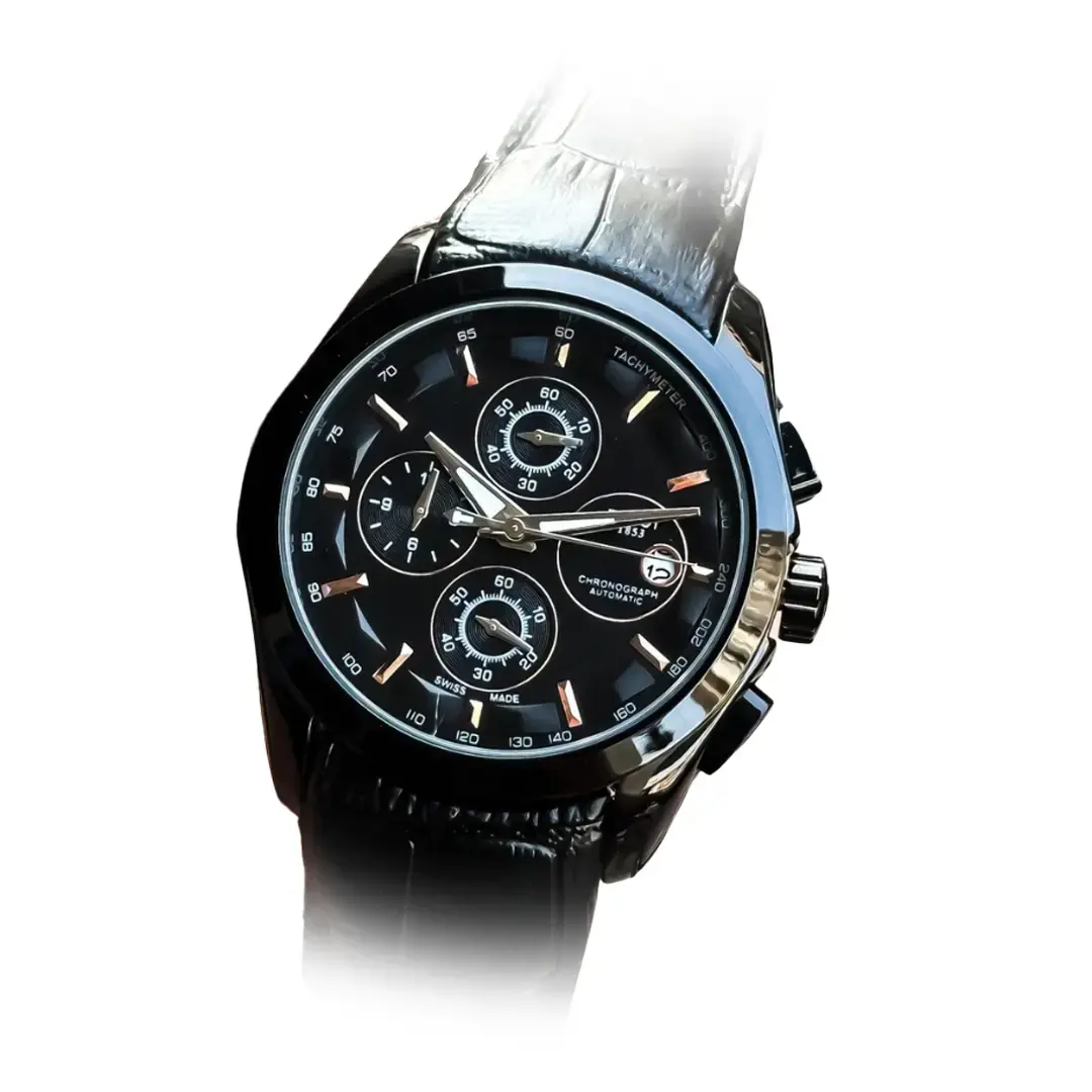 The Elegant Black Chronograph Watch is the perfect blend of style, functionality, and modern design. Featuring a sleek black dial and a genuine leather strap, this watch is a versatile accessory for both formal and casual settings. Its chronograph functionality adds a layer of precision, making it not just a fashionable statement but a reliable tool for everyday timekeeping.